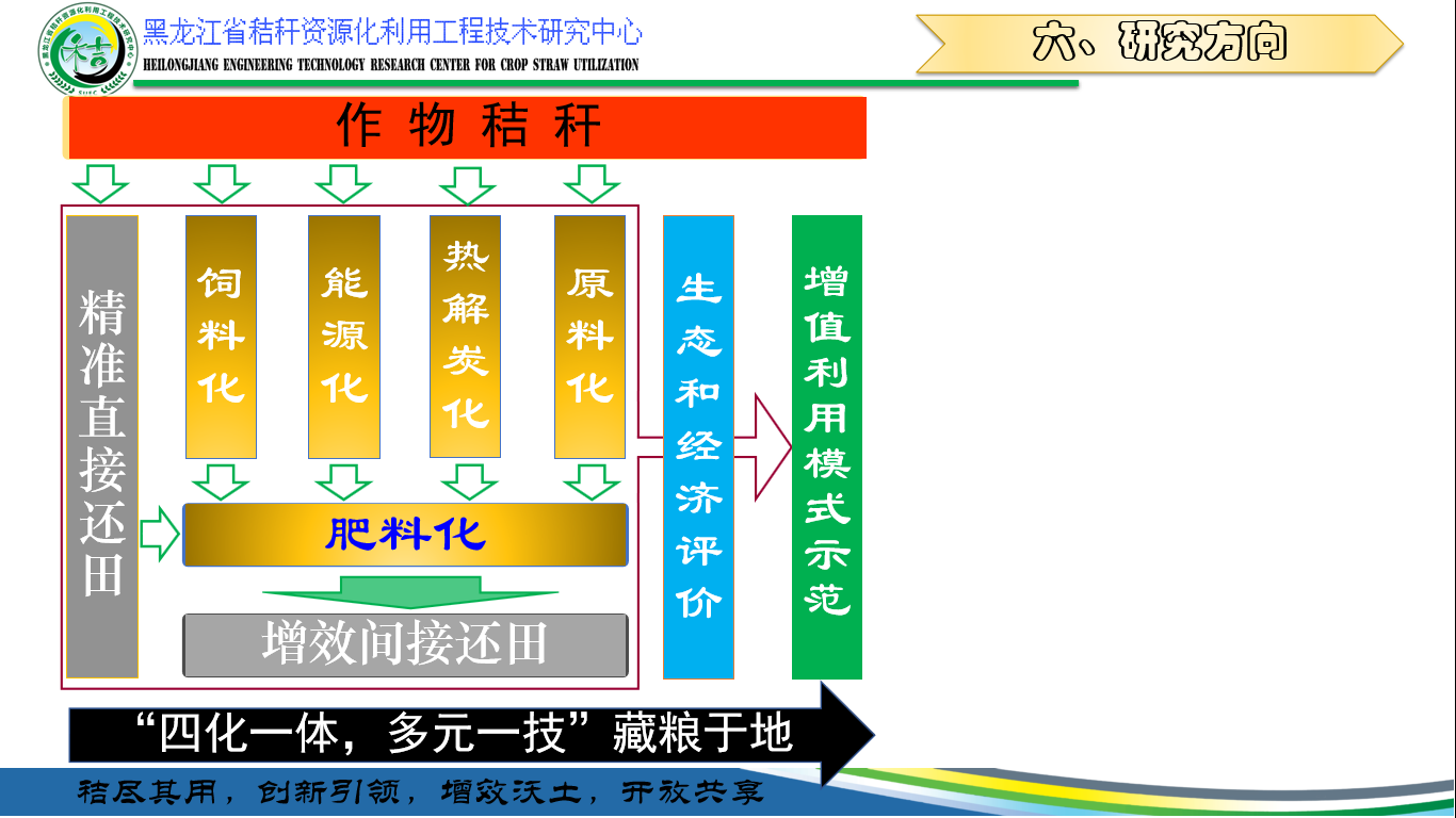 中心以建成省内一流,国内具有影响力的秸秆综合利用研发机构和产业孵化中心为目标,坚持“植根垦区、立足大庆、面向龙江、辐射全国”的服务定位,坚持“秸尽其用,创新引领,增效沃土,开放共享”的指导原则,坚持“四化一体、多元一技”的总体思路,即以肥料化为主体,开展秸秆炭化、沼气化、饲料化和原料化关键共性理论技术及产品研发推广;以秸秆直接还田技术为前提,开展多化组配、高效增值的间接还田利用的生态农业模式创新集成及示范推广。同时,中心以市场为主导,建立新型产、学、研融合的孵化平台,培养秸秆资源化利用研发推广专业队伍,推动行业产业发展,实现“藏粮于地、藏粮于技”。