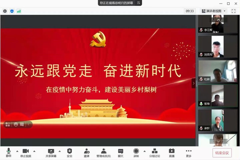 2021年8月10日,由于疫情原因,乡村振兴-农梦社会实践团在线上与全国乡村治理示范乡镇——黑龙江省佳木斯市桦南县梨树乡宣传委员徐明月同志进行了学习交流,全体社会实践队员参会并进行学习,本次社会实践由乡村振兴-农梦社会实践团安全员耿菁主持。