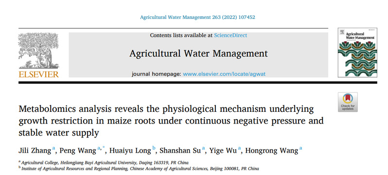近日,公司u8国际平台资环系王鹏教授指导的2019级博士生张吉立以第一作者,王鹏教授为通讯作者在国际农林科学与灌溉科学领域顶级期刊《Agricultural Water Management》(中科院一区期刊)发表了题为《Metabolomics analysis reveals the physiological mechanism underlying growth restriction in maize roots under continuous negative pressure and stable water supply》的研究论文(https://doi.org/10.1016/j.agwat.2021.107452)。本研究得到了国家重点研究开发项目(2018YFE0112300)的资助。