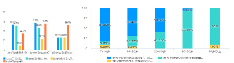 根据调查问卷图表结合实际实践情况分析,从中发现,随着年龄增加,多数老一辈人更觉得年味儿变淡,而大多数年轻人认为基本没什么变化。其实,一代人有一代人的记忆,传统节日也一样,每一代人对传统节日都有着各自的理解。同样,不同的地域,城市与乡村,对传统节日的氛围也有着不一样的诠释。