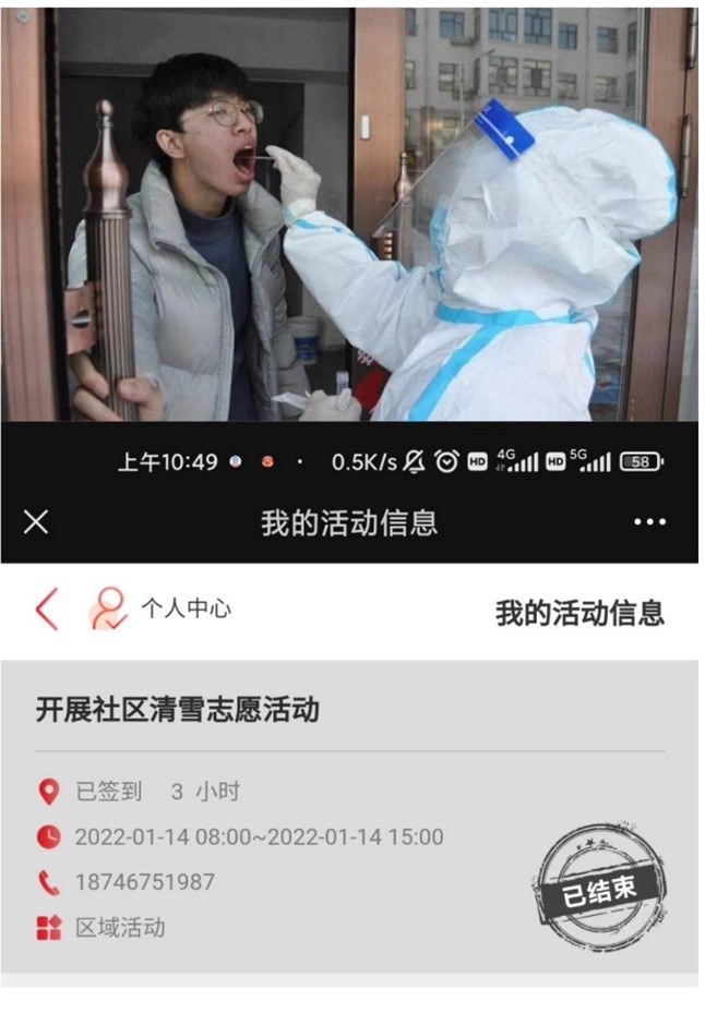 全民核酸采集是必不可少的环节。我们组织并维持大家进行核酸采集工作,要求每个人都要采集到位。大年三十的时候,我门还给卡口值班的志愿者门送去了饺子。虽然不多,但是也是一份祝福一份感谢。经过了一个半月的志愿服务,我获得了“优秀志愿者”证书。