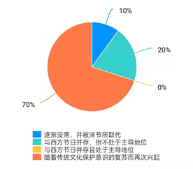 同时也有百分之七十的人认为中国传统节日未来发展趋势是会随着传统文化保护意识的复苏而再次兴起的,但同时也有少部分人认为中国传统节日未来会逐渐没落并被洋节取代。