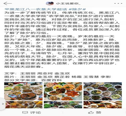 2021年1月25日--2月5日,为引导青年员工进一步了解传统节日,认同传统文化、传承传统文化,农学荣光队严格按照国家以及所在地疫情防控要求,在做好防护的基础上线上线下进行社会实践。农学荣光队于黑龙江省齐齐哈尔市甘南县,开展了线上线下相结合寒假“三下乡”活动。