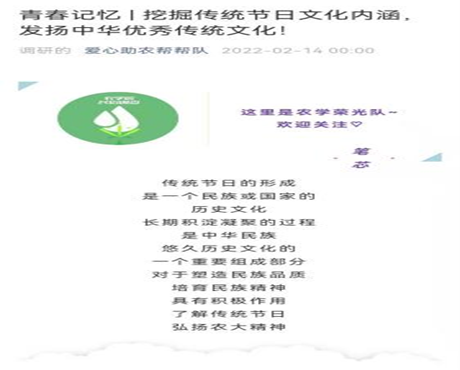 百节年为首,春节是中华民族最隆重的传统佳节。除旧布新,祈岁祭祀,纳福攘灾......形式丰富多彩的春节民俗凝聚着中华传统文化精华,也承载着博大精深的中华文化底蕴。寒假期间,身处全国各地的农学学子们正进行着以青春记忆-挖掘传统节日文化内涵为主题的社会实践活动,让我们一起来看看吧!