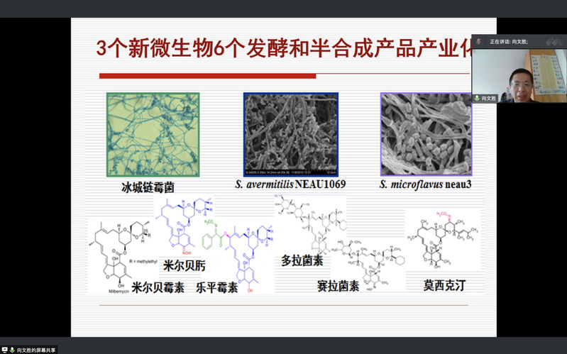 向文胜教授的报告图文并茂,直观生动,内容十分丰富,研究成果突出。在报告中,向文胜教授介绍了他课题组基于微生物研发新农药的研究成果,包括3个新微生物菌种及由其发酵生产和半合成的6个已经实现产业化的新产品。谷维菌素的产业化,将助力绿色农业、品质农业,并不断提升其生产应用技术,为社会创造更大价值。