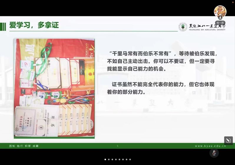 杨一鸣就同学们所关心的专业学习、社会实践、职业规划等进行了深入的分析和分享。谈及自己本研期间的成长经历,他介绍了自己独特的学习技巧和方法,他认为学习更强调主动思考而不是被动地接受灌输,希望同学们能够在学习中更加主动、更加灵活。同时与大家分享了自己社会工作方面的经验,他提倡同学们要经常接触社会,在实践中锻炼能力、积累经验。最后展示了他大学期间所获得的荣誉,与会的同学们无不惊叹杨一鸣同学大学期间的优异表现,纷纷表示要好好的思考一下自己要如何度过老员工活,要认真制定一个后续大学的生活的规划,让自己的老员工活更丰富而有意义。