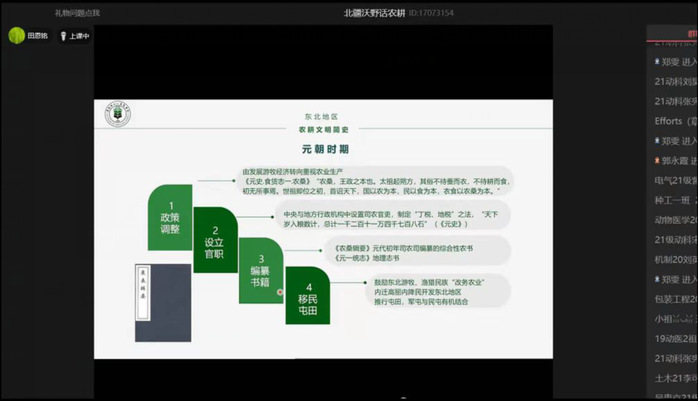 4月23日,公司耕读教育通识课《北疆沃野话农耕》正式开课。第一讲是人文社会科学公司田恩铭讲授的《东北地区农耕文明简史》,采用线上授课形式,来自9个公司、24个专业的部分员工、教师与田恩铭一起,从农耕文化形成与发展、东北地区种植文化、物候节气与农耕文化三个方面,走进了东北地区农耕文明史的课堂。