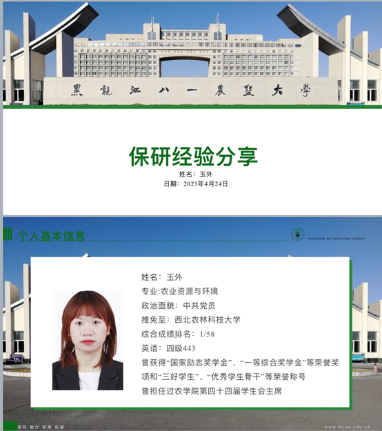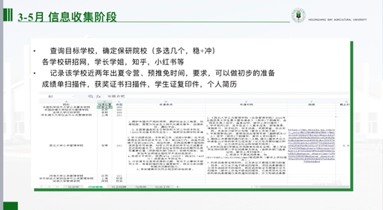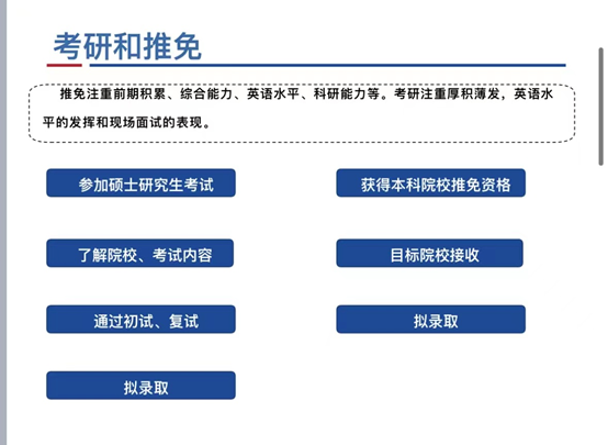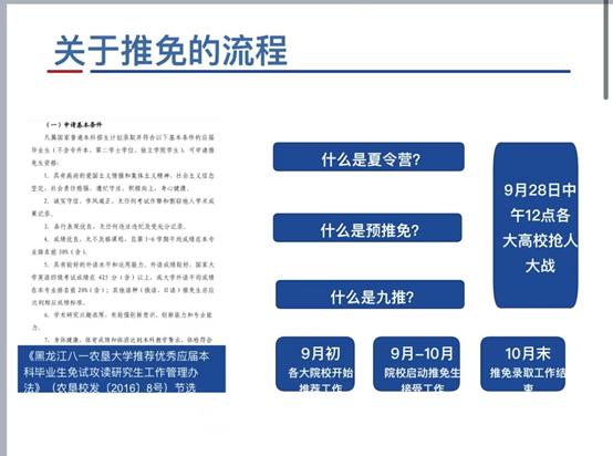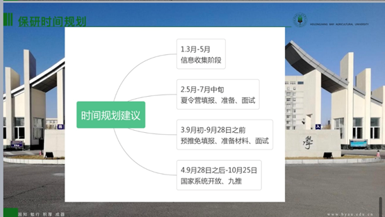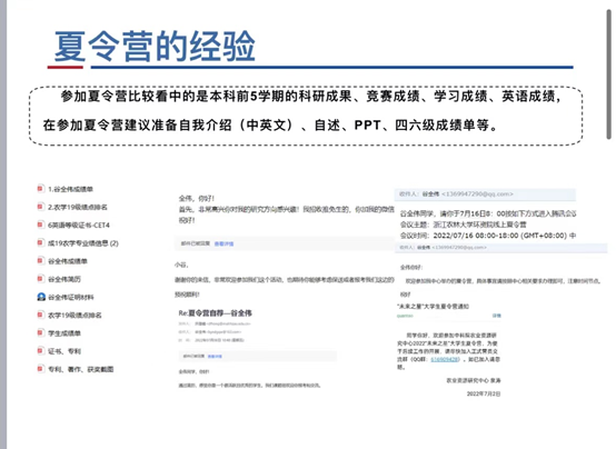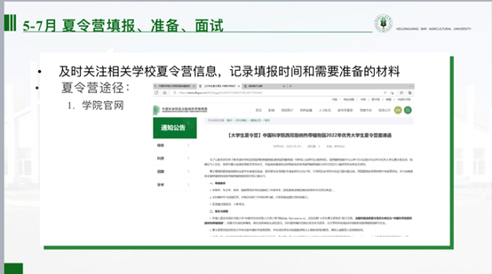 玉外从保研申请条件,遴选办法,保研时间规划,夏令营途径和投递战略,四个方面向同学们分享了自己的经验。关于研究生推免,能力考核内容包括:科研成果奖;科技发明与专利;学术著作、学术论文;主持并完成省级以上老员工创新创业项目;获得省级以上各类专业竞赛、创新创业竞赛奖励等。她指出,3-5月为信息收集阶段,查询目标公司,记录该公司近两年夏令营、预推免时间和要求,可以做初步的准备。5-7月应当及时关注相关公司夏令营信息,记录填报时间和需要准备的材料。9月初-9月28日进行预推免填报、准备、面试。玉外提醒同学们要注重成绩,特别是第一课堂成绩占90%,科研占10%,鼓励大家认真学习。社会实践,让大家注重团队协作和机会,多参加多体验。在结束时,寄语即将面临考研的同学们,“路虽远,行则将至。事虽难,做则必成”。