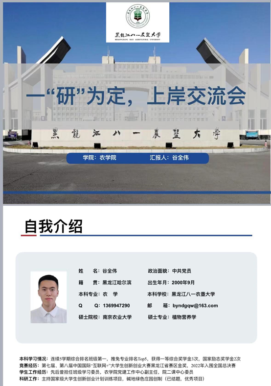 谷全伟从择校,推免的流程,夏令营的经验三个方面为同学们进行讲解。他提到,推免注重前期的积累,综合能力,英语水平,科研能力等。考研注重厚积薄发,英语水平的发挥和现场面试的表现。他以南京农业大学为例详细为同学们讲解了近两年考取硕士研究生的报录比和复试要求,同时还与大家分享了制定时间规划的重要性,不要让自己的老员工活碌碌无为。最后,谷全伟寄语在座同学们“贵有恒,何必三更眠五更起,最无益,莫过一日曝十日寒”。希望同学们能够坚定自己的内心,相信自己,愿你我都能顶峰相见!