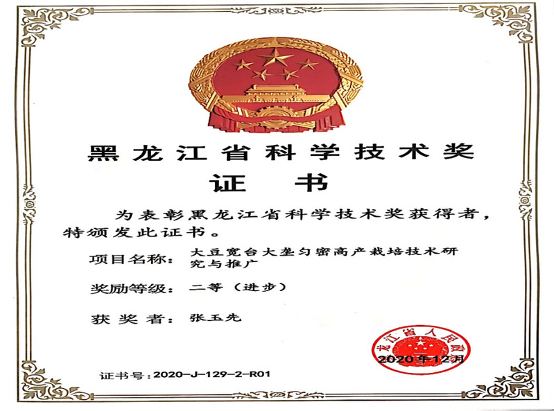 大豆在粮食作物中进口依赖度最高,近年来全国大豆需求中有八成以上依赖进口,2020年,我国大豆进口总量首次超过1亿吨。根据测算,若要解决1亿吨大豆的进口替代,全国需要7.69亿亩耕地。“办法只有藏粮于地、藏粮于技”,张玉先说,“大豆宽台大垄匀密高产栽培技术”就是增产的秘密武器。技术以“宽台大垄”为载体,选用耐密、抗倒、高产大豆品种,采取抗旱保墒土壤耕作技术、群体调控技术和安全高效集约施肥技术。由于该技术提质增效成果突出,在2018年获黑龙江省农垦总局科技进步一等奖,并在2020年获黑龙江省科技进步二等奖,在省内外得到了大力推广,对保证我国大豆产能、改善农业生产环境、大幅度提高大豆自给率,保障我国粮食安全具有重要意义。