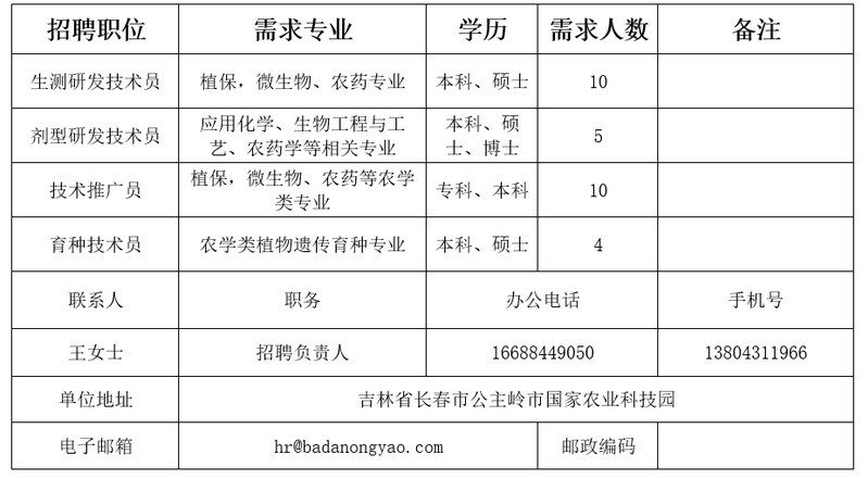 吉林省八达农药有限公司招聘需求表