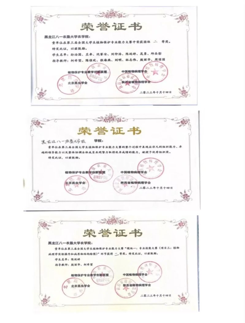 公司植物保护专业孙治国、陈廷婷、兰卓、晁勇、沈家安、刘仲浩等本科生在植物保护学科带头人左豫虎教授,以及学科青年教师柯希望、张海燕、陈佳欢等的带领下参与了此次大赛。公司参赛员工参加了3大模块中7个小项的比赛,包括昆虫微景观展示与现场标本制作项目、植物病虫害识别、植物病理学实验操作和病原物结构绘图、昆虫解剖和结构绘图、创新创业优秀项目展示、本科生学术交流报告等。比赛过程中公司员工表现优异,展现了良好的精神风貌和专业技能,荣获团体二等奖1项,陈廷婷同学在植物病理学实验操作和病原物绘图项目中荣获二等奖1项,公司参赛师生的优秀表现也获得了组委会的认可,荣获优秀组织奖1项。