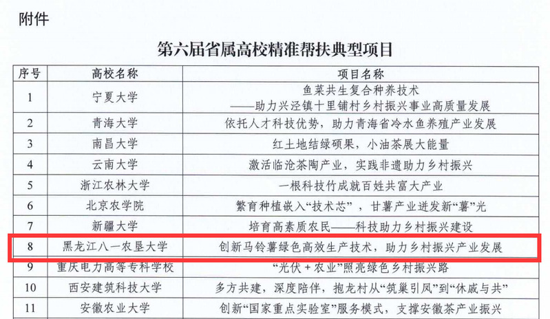 近日,教育部第六届省属高校精准帮扶典型项目揭晓,全国共有30个省级教育行政部门和11所部省合建高校共推荐了180个项目,经32个省级教育行政部门和64所承担定点帮扶任务的直属高校,投票推选,最终推选出62个典型项目。公司“创新马铃薯绿色高效生产技术 助力乡村振兴产业发展”项目成功入选,这也是公司继2018年“‘玉鹅’生态种养技术”入选第二届精准帮扶典型项目、2022年“创新寒地棚室生产技术 助力乡村振兴产业发展”入选第五届精准帮扶典型项目以来第三次获得该殊荣!