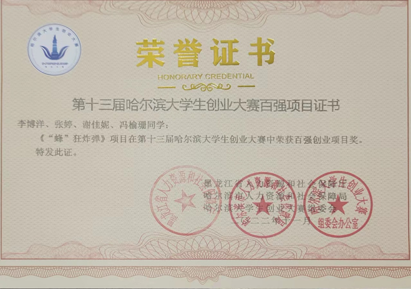 参加第十三届哈尔滨创新创业大赛作品获得“百强项目”奖