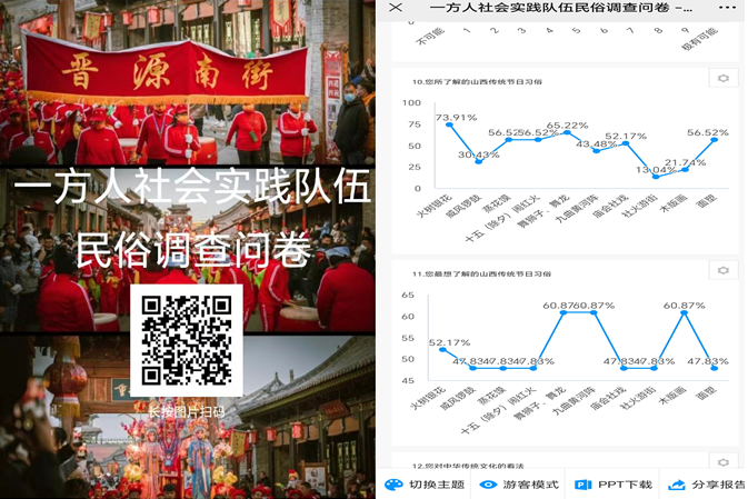 队员们通过线上观看“社火中国年”“年的味道”等传统文化纪录片,线下进行问卷调查,调研山西本地人民对“三晋”传统节日的了解和传承程度,并形成了总结报告。