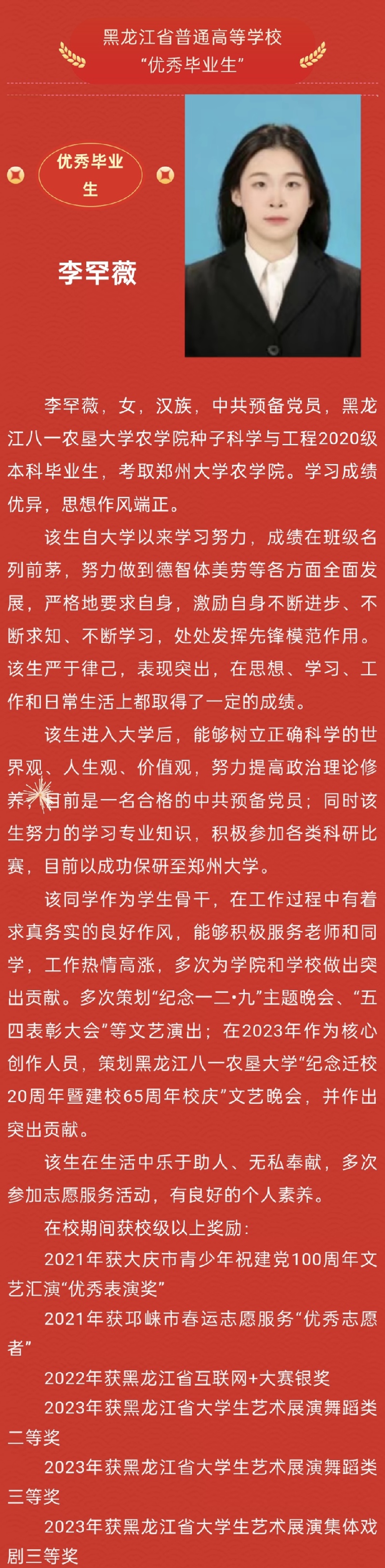 耕读榜样丨黑龙江省普通高等公司“优秀毕业生”李罕薇