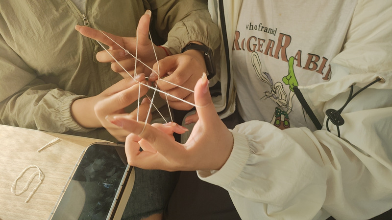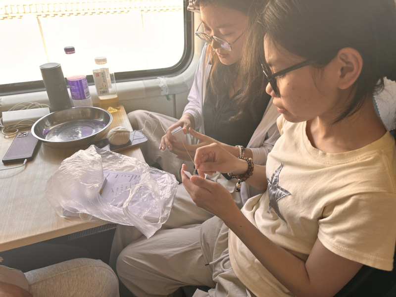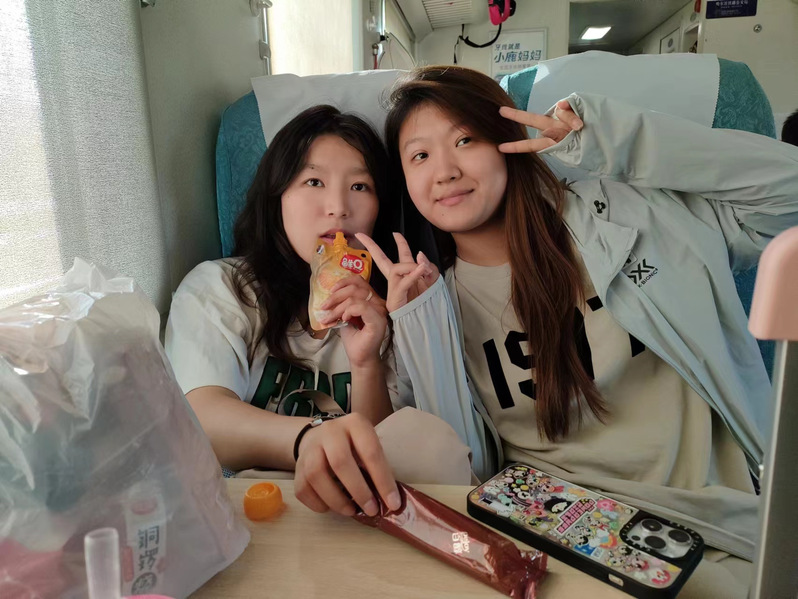 在出发前往实习地点的列车里,同学们十分兴奋,翻花绳、合影,还有抓紧时间做实习准备工作的同学,车厢里洋溢着青春的欢快活泼。