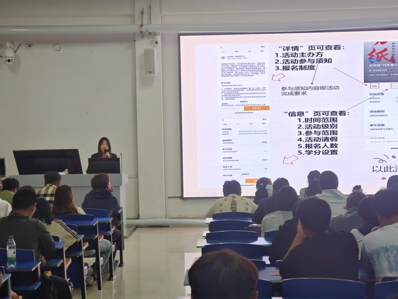 讲座中,黄伟东老师详细介绍了“第二课堂成绩单”制度管理实施细则,使大家清晰地了解公司的学分体系,对七个模块的学分进行了详细解读,着重强调了第二课堂对综合素质测评的重要性以及第一课堂和第二课堂的密切关系,希望同学们能够积极参加各类文体活动,顺利修满第二课堂学分。随后,杨杰同学带领全体新生们学习了第二课堂活动管理平台“到梦空间”的使用方法,详细讲解了“到梦空间”中活动的报名和签到环节,并现场进行了演示和提醒,对同学们提出的问题进行了集中解答。