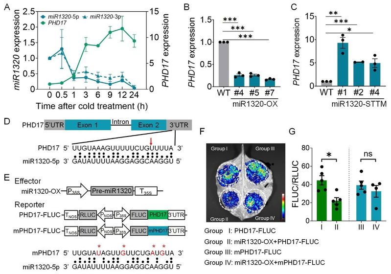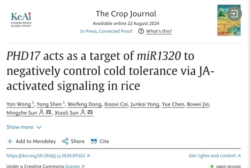 近日,u8国际网站在The Crop Journal在线发表了题为“PHD17 acts as a target of miR1320 to negatively control cold tolerance via JA-activated signaling in rice”的研究论文。与物种间保守的miRNA家族相比,水稻特有的miRNA参与耐冷性调控的研究较少。研究者前期报道了一个水稻物种特异的miR1320靶向一个ERF/AP2转录因子ERF096调控冷胁迫应答过程。本研究发现PHD17基因作为miR1320的靶基因,通过茉莉酸(JA)激活的信号途径负调控水稻耐冷性。