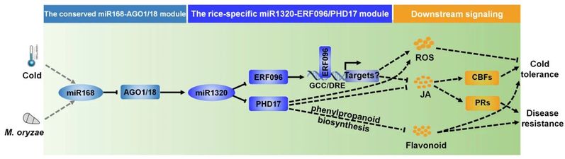 图7 miR1320调控水稻耐冷性和抗病性的工作模型