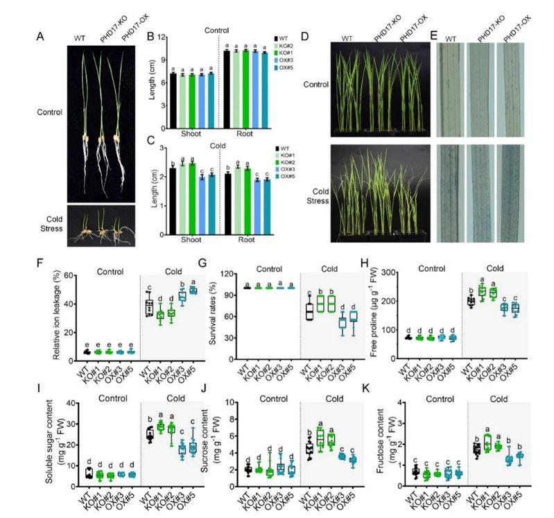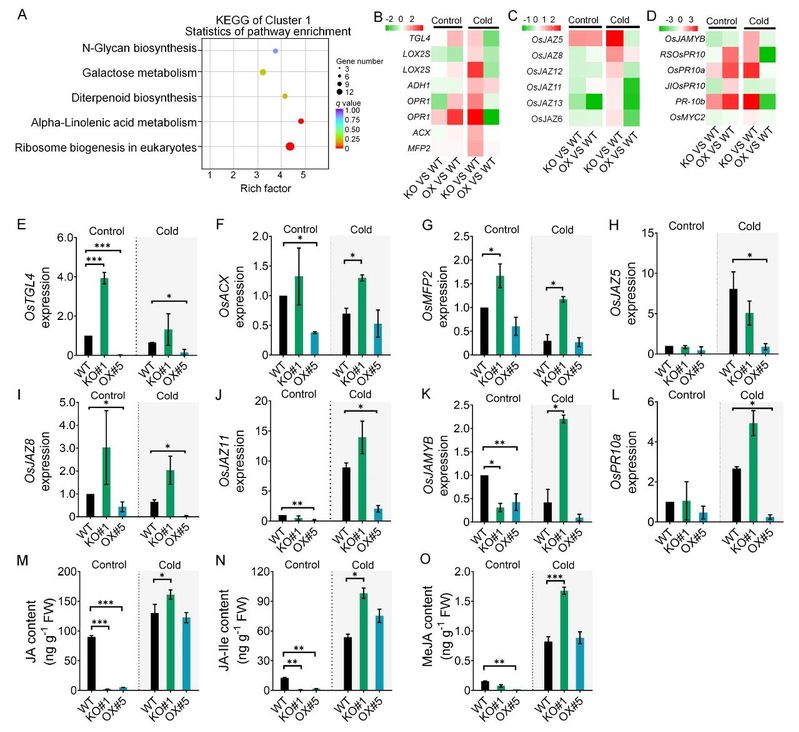 作者利用表达模式分析、5'RACE和双荧光素酶分析,证实了miR1320靶向并剪切PHD17 mRNA(图1)。通过亚细胞定位分析和酵母转录激活试验,发现PHD17是一个核定位的转录激活因子(图2)。PHD17过表达降低水稻苗期耐冷性,而PHD17敲除株系则展示出比野生型更高的耐冷性(图3)。通过对PHD17转基因株系进行RNA-seq结合生理指标测定,发现PHD17调节冷胁迫下水稻体内ROS平衡和类黄酮积累(图4)。K-均值聚类分析发现差异表达基因显著富集在JA生物合成途径,qRT-PCR和JA相关激素含量测定证实了PHD17影响JA生物合成和信号通路基因表达(图5)。外源施用MeJA或IBU(JA合成抑制剂)消除了冷胁迫下PHD17转基因水稻在表型、ROS清除及DREB1B基因表达的差异(图6)。