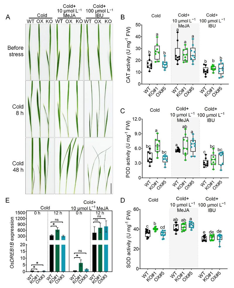 图6 外源施用MeJA或IBU消除了PHD17转基因株系耐冷性的差异