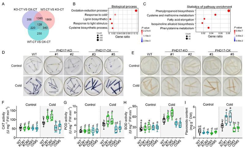 图4 PHD17调节冷胁迫下水稻体内ROS平衡和类黄酮积累