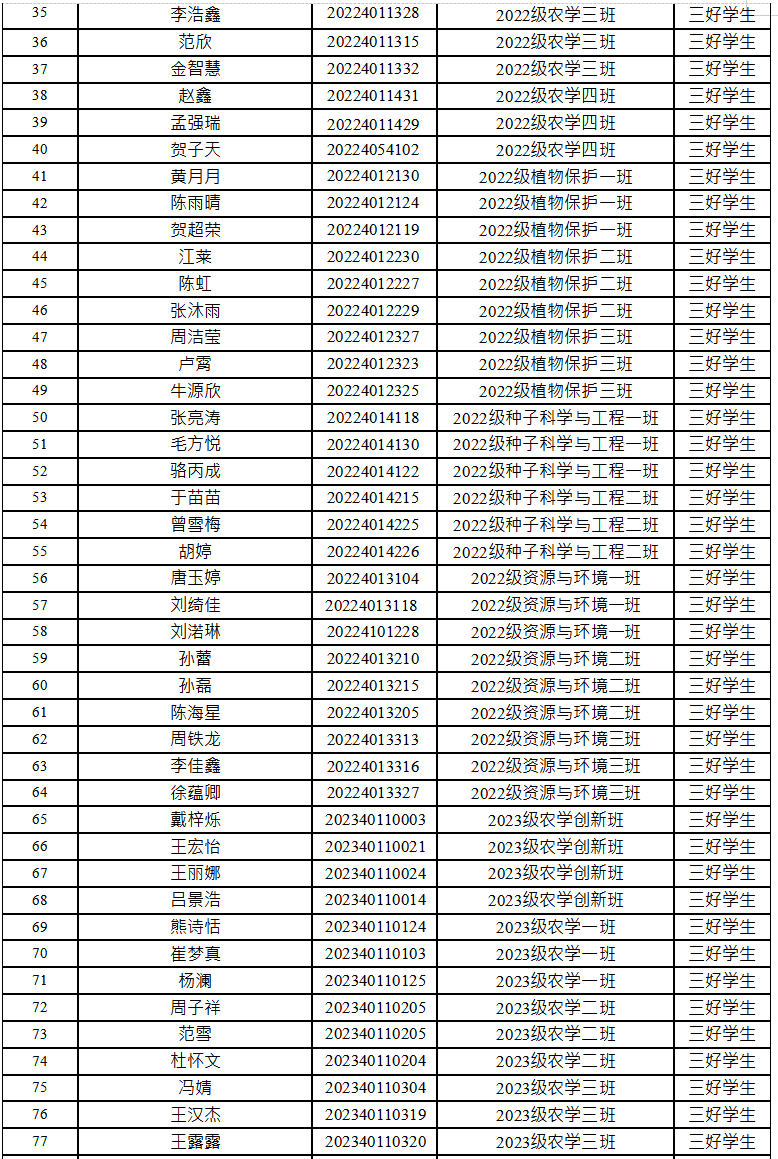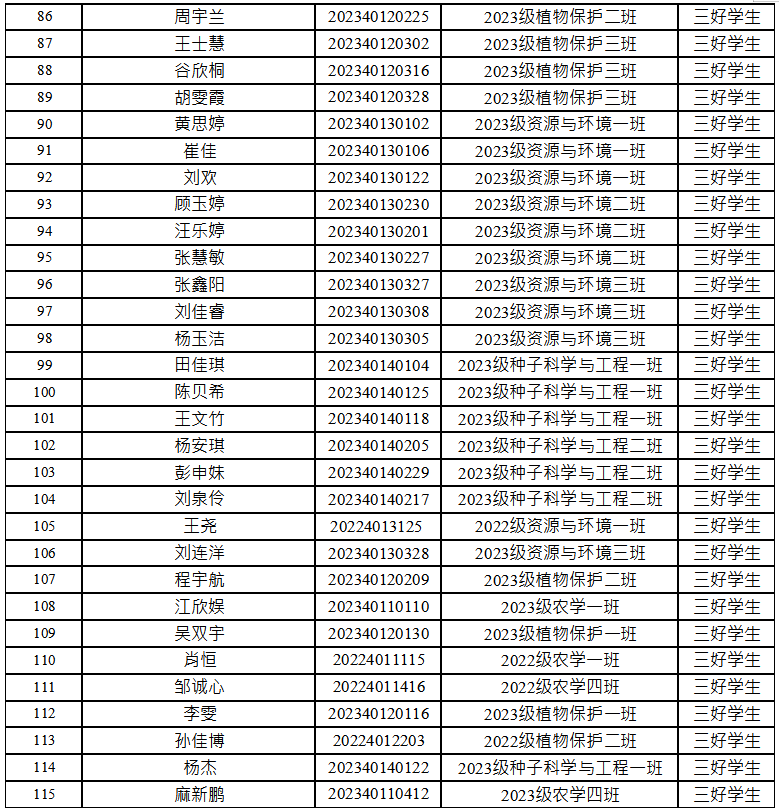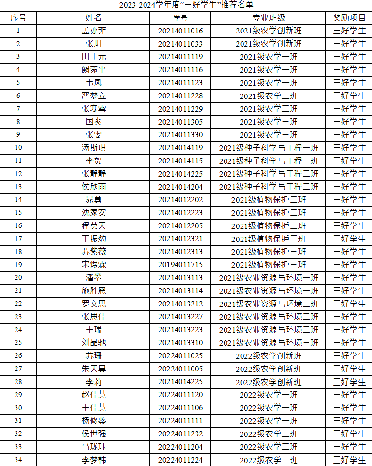 根据公司《关于评选2023-2024学年综合奖学金、先进集体和先进个人的通知》要求,依据《u8国际网站本科生奖励规定》,经自主申报、资格审核、班级测评、评审委员会评审,最终推荐2021级农学一班等11个班级为“优良学风班”荣誉称号,推荐孟亦菲等115名本科生为校级“三好员工”荣誉称号,现予以公示,详细名单见附件。
