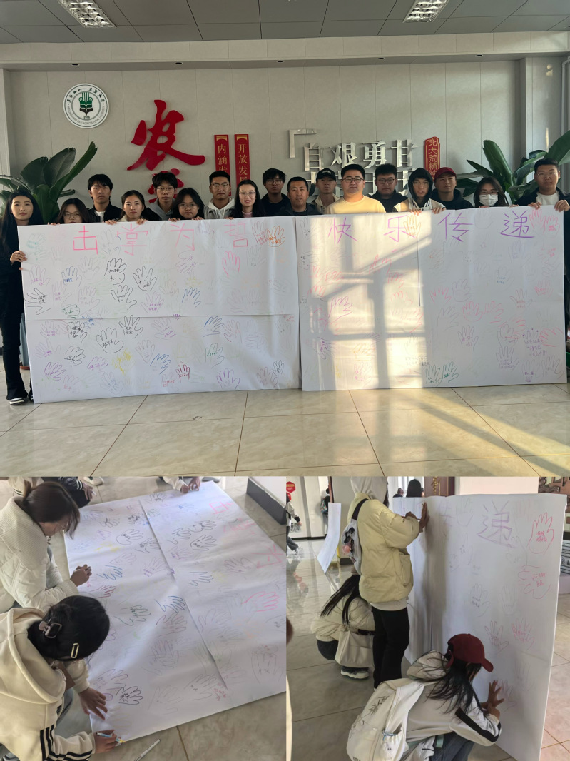 同学们在纸上描绘自己的手印,写在手印旁写下自己的快乐与烦恼或写下自己对未来期望的寄语。通过开展趣味活动的方式,让同学们在五彩斑斓的画布上找到了表达自我的平台。同时也使同学们在活动中分享快乐,释放压力。