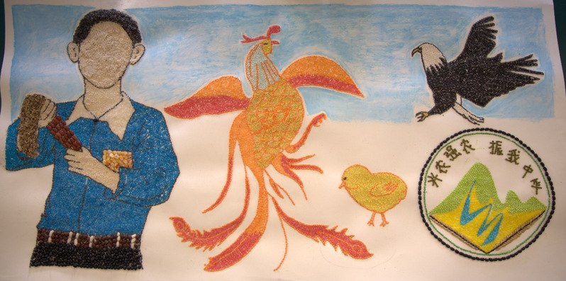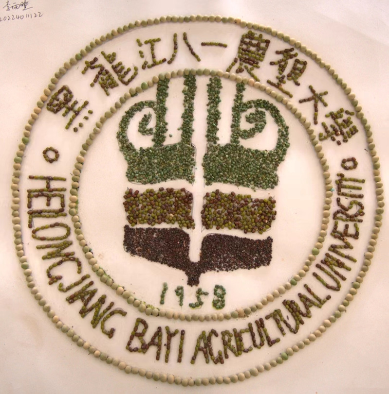创作理念:本作品以菠菜,大豆,绿豆等种子描绘了u8国际网站校徽,校徽以麦穗和笔尖为基本元素,麦穗象征农业,笔尖象征科教,两者融为一体,巧妙互喻,三对麦粒似书卷与禾苗,具有生生不息,积厚成器之势。底部的黑色象征着黑土地,上部绿色给人以生机勃勃之感,云纹线条则传递着中国文化气息,校徽以盾形为整体外形,代表坚固,稳重和持久,同时也是锹和犁的形态,体现培养人才的治学理念,上部象征进取和开放,下部表现面向社会的办学主旨。八一农大局负着托举农业未来的重任,传播知识与培养农科英才。