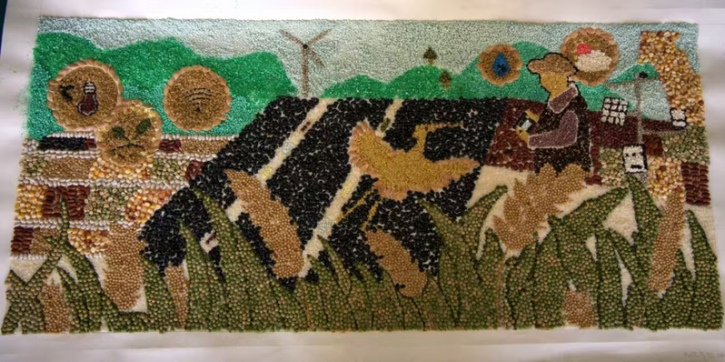 创作理念:种子画作为一种独特的艺术形式,将传统的农耕文化与现代艺术创新相结合。通过对种子的巧妙运用和图案的精心设计,创作出了一幅幅具有创意和文化内涵的作品。图中的粮食、田地等元素,不仅展示了农耕文化的魅力,也传递了对粮食的珍视和感恩之情。