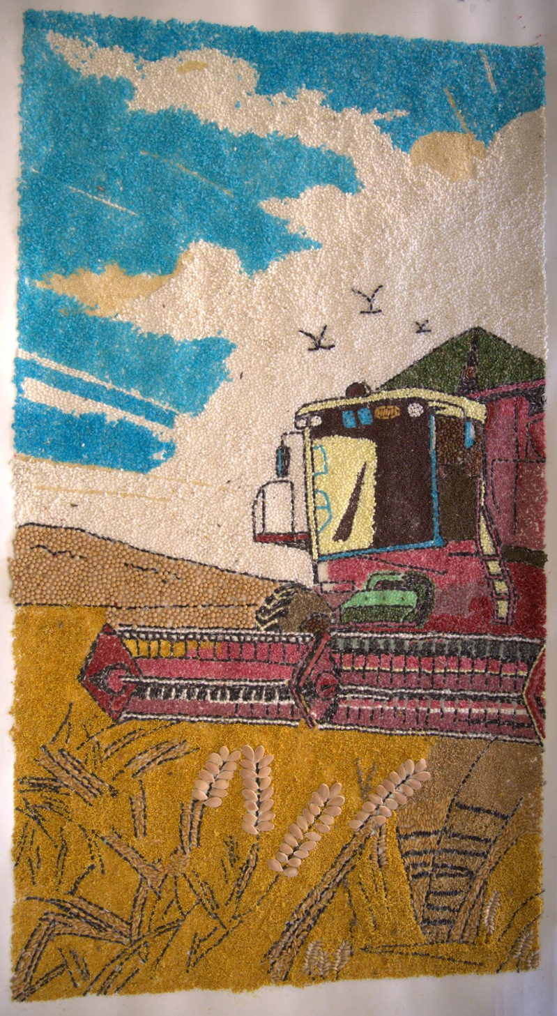 创作理念:整幅画是利用水稻、小米、绿豆、黑米、小麦、糯米、白芸豆、黑豆、红豆、黄豆、贵族菠菜、高粱等种子构成稻谷堆、稻田、收割机、田间小路、山间河流、桥、粮仓、连绵起伏的山、太阳及蓝天白云等元素。