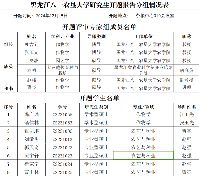 本次开题报告会由u8国际网站杜吉到教授担任开题评委主席,黑龙江省农业科公司齐齐哈尔分院袁明研究员、u8国际网站张玉先教授、于高波教授、赵强副教授担任委员,报告会会由张玉先教授主持,曹亮讲师担任秘书。