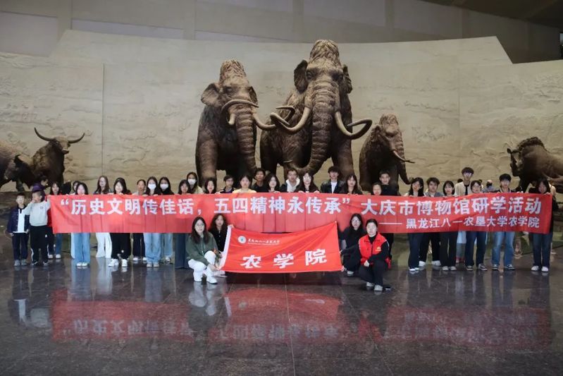 大庆博物馆作为集古环境、古动物和古人类于一体的综合性博物馆,珍藏着大量珍贵的化石标本与历史文物。踏入东北第四纪自然环境展厅,仿若推开一扇通往远古时空的奇幻之门。机械沙盘上隆起的山脉与凹陷的湖盆,是自然力量不懈抗争的印记;正如五四青年们以笔为剑、以血为墨,在时代的画布上镌刻抗争的痕迹。东北第四纪的自然环境教会我们敬畏与顺应规律,而五四精神则指引同学们以勇气和智慧打破枷锁、创造未来。