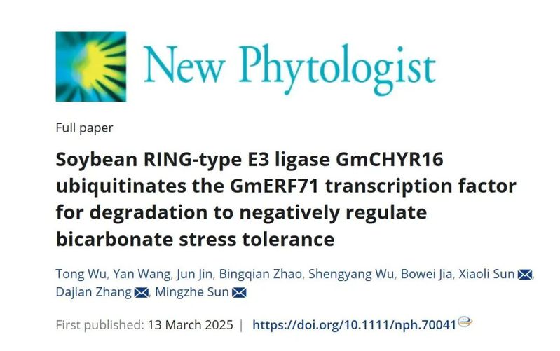 近日,公司u8国际平台孙晓丽/孙明哲团队在国际知名期刊New Phytologist(中科院一区TOP,IF=8.3)发了题为“Soybean RING-type E3 ligase GmCHYR16 ubiquitinates the GmERF71 transcription factor for degradation to negatively regulate bicarbonate stress tolerance”的研究论文。该研究以耐苏打盐碱功能显著的转录因子GmERF71为切入点,揭示了GmCHYR16通过泛素化修饰GmERF71负调控大豆碳酸盐胁迫应答新机制,该研究有助于深入理解大豆碳酸盐胁迫耐性的分子机制,为通过生物育种手段改良大豆耐盐碱性提供了新的理论依据和潜在靶点。