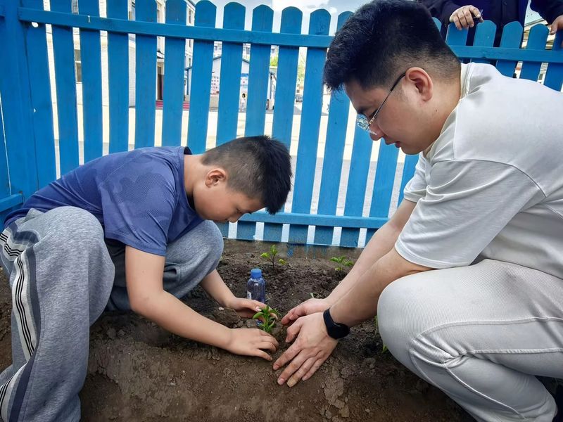 活动现场,“党员老员工 - 共青团员 - 少先队员”三代联动的温馨场景成为亮点。“大家看,西瓜幼苗需要充足的阳光,浇水时要避免直接浇在叶子上......”共青团员志愿者的讲解兼具专业性与趣味性,孩子们认真聆听,眼神中充满对劳动知识的渴望。在志愿者带领小员工种植菜苗时,党员志愿者们则趁机讲解“绿色农业”“智慧农业”等生态理念;党员教师奔走在员工群体中,为孩子们答疑解惑。