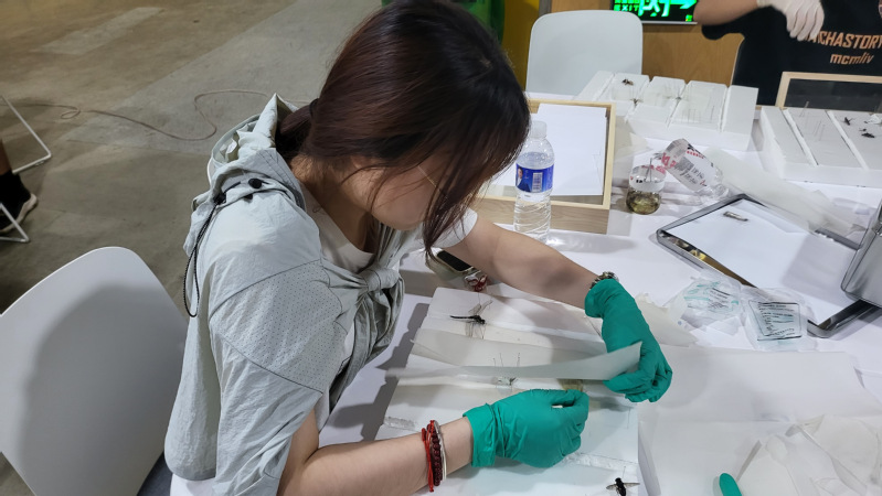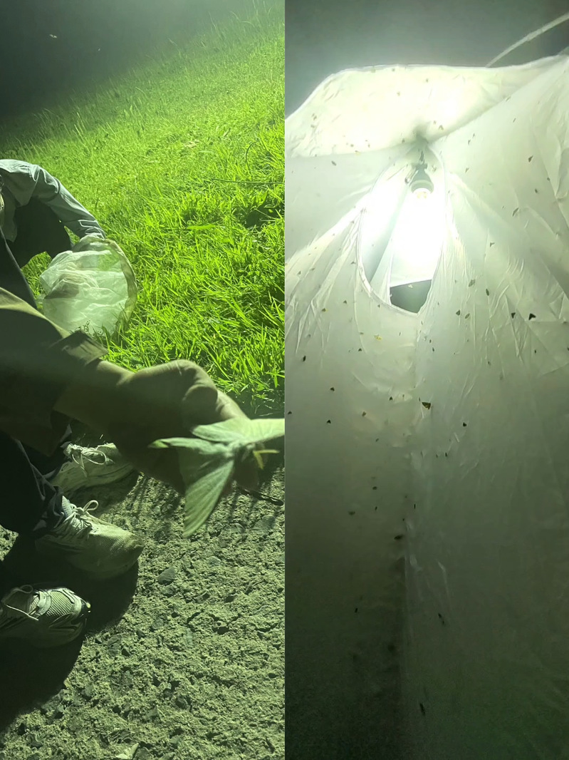 晚饭过后,师生们先聚集在雪具大厅,讲解关于昆虫标本制作知识,晚间,我们又在开阔区域架设好专业的诱虫灯和白色幕布,构建起一个动态的昆虫生态观察场。诱虫灯发出的光芒吸引了大量具有趋光性的昆虫。