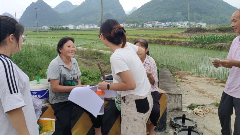 在村长的引领下,实践小队首先聚焦于种植模式、作物种类及农田管理措施展开调研。据了解,福塘村经过管辖区调整后,现由多个屯组成,各个屯区的种植情况基本一致。受地形起伏限制,当地难以实现大规模机械化耕作,耕地多呈田块分散状态,以家庭为单位进行耕作。村民依托穿村而过的小溪这一天然水源建造水渠,通过采用分水灌溉的方式,为种植作物提供充足的水源。