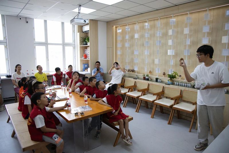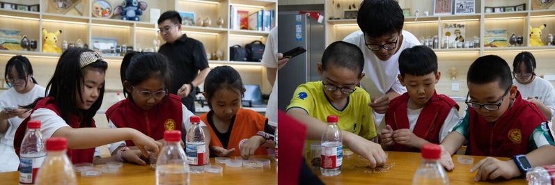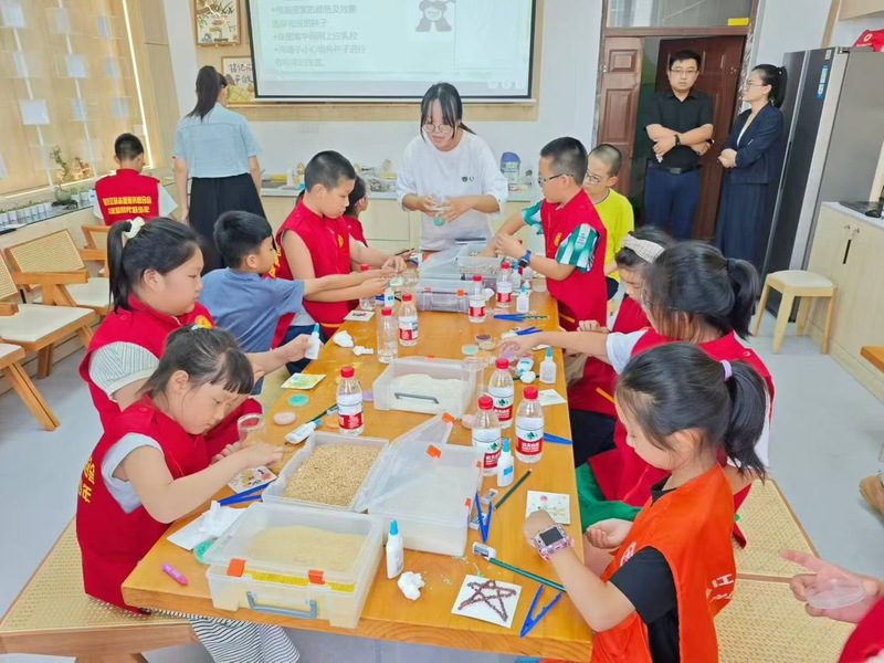 实践环节,孩子们在志愿者指导下亲手触摸五谷、设计创作,将知识转化为充满童趣的艺术成果,工作室洋溢着创造的活力与惊叹。