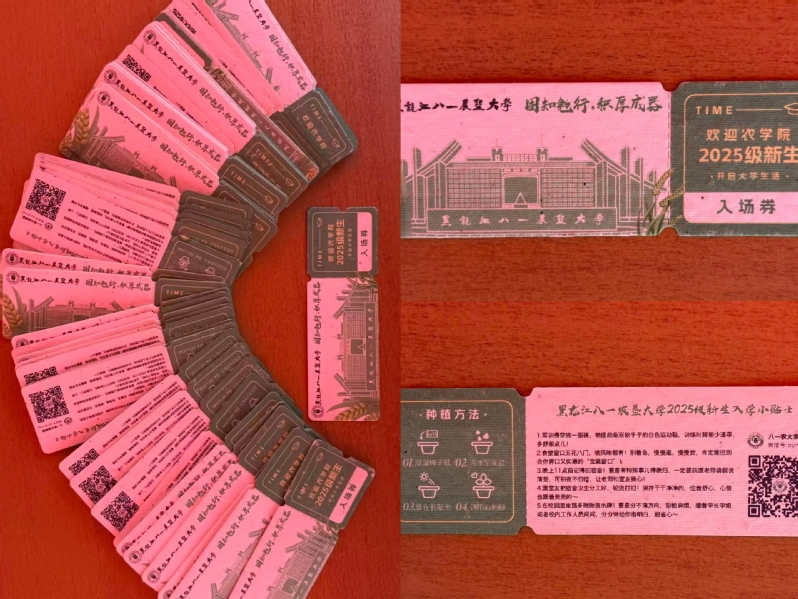2025 级新生“农大入场券种子卡”以清新绿为主色调,正面印 “u8国际平台 2025 级新生” 字样与校园建筑,仪式感十足;背面有报到流程等入学小贴士,扫码可关注公司公众号。