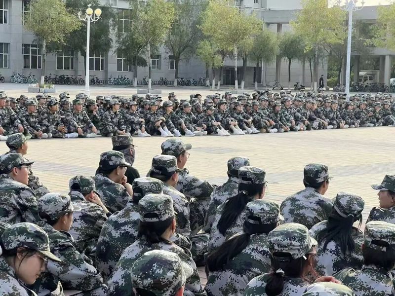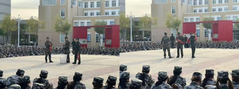 培训现场,教官结合校园火灾隐患案例,细致讲解火灾成因、日常防火要点及火灾逃生技巧。随后,教官手持灭火器,分步演示操作流程:提起灭火器、拔下保险销,握住喷管,压紧手柄,对准火焰根部喷射,动作规范且清晰。身着迷彩服的新生们围坐四周,认真观摩学习,现场秩序井然。